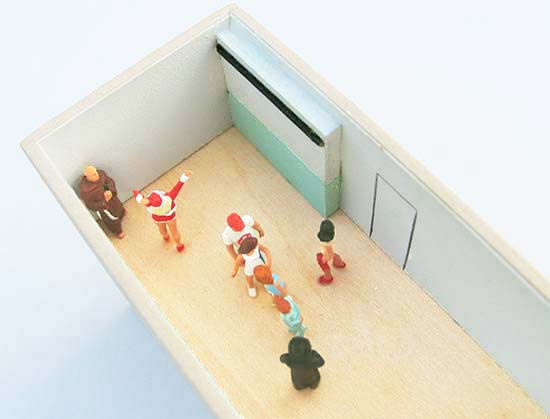composed with little people placed in little boxes. Just to make it interesting, he installs these pieces across a wall at different heights, making some scenes visible, others invisible, and some