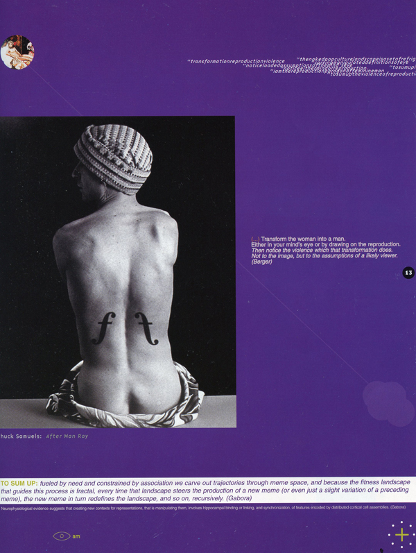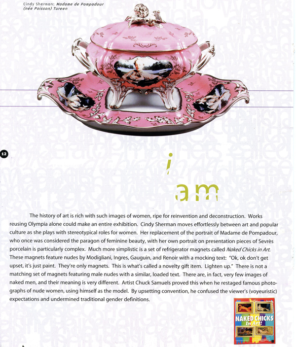 This exhibition examined how works of art have been reused and reinterpreted in both art and popular culture. Artists included Nobuyoshi Araki, Nancy Burson, Eileen Cowan, Dorit Cypis, Ron Desmett, Didi Dunphy, Sandi Fellman, Alain Fleischer, Scott Grieger, Elizabeth Lennard, Sherrie Levine, Joe Mama-Nitzberg, Issey Miyake, Yasumasa Morimura, Brian Moss, Warren Neidich, Diane Neumaier, Stephen Prina, Rob Rogers, Anne Rowland, ROY, Chuck Samuels, Cindy Sherman, Starn Twins, Mark Tansey, and Jody Zellen. Catalogue with essay and color images designed by Jason Simmons.
