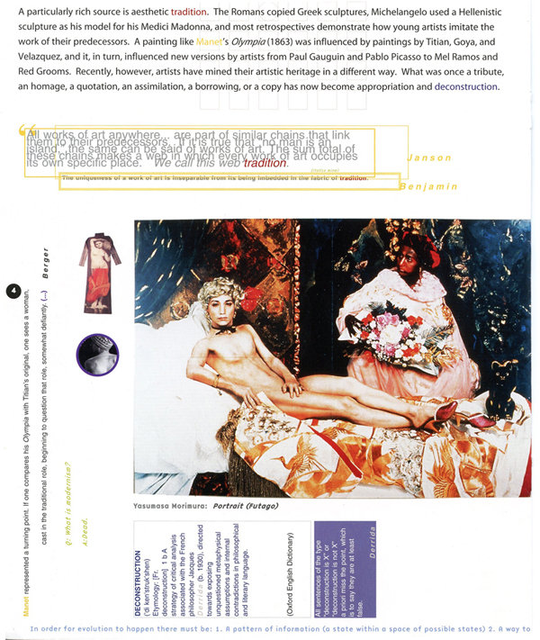 …art has always drawn upon its own tradition but what was once a tribute, an homage, a quotation, an assimilation, a borrowing, or a copy has now become appropriation and deconstruction. With an increased understanding of how works of art not only reveal ideology but also help to construct it, artists now critique work by their ancestors while recycling their imagery….Several years ago, while in Thailand I had dinner at a tiny restaurant called Cabbages and Condoms which was run by an organization that was also involved in sex education. I was amused by a t-shirt featuring the Mona Lisa holding a condom package. Now I am amazed by the unforeseen third-world meaning discovered in this transplanted icon of European history. Why the Mona Lisa? Wouldn’t Olympia, if one was choosing a Western image, make more sense?